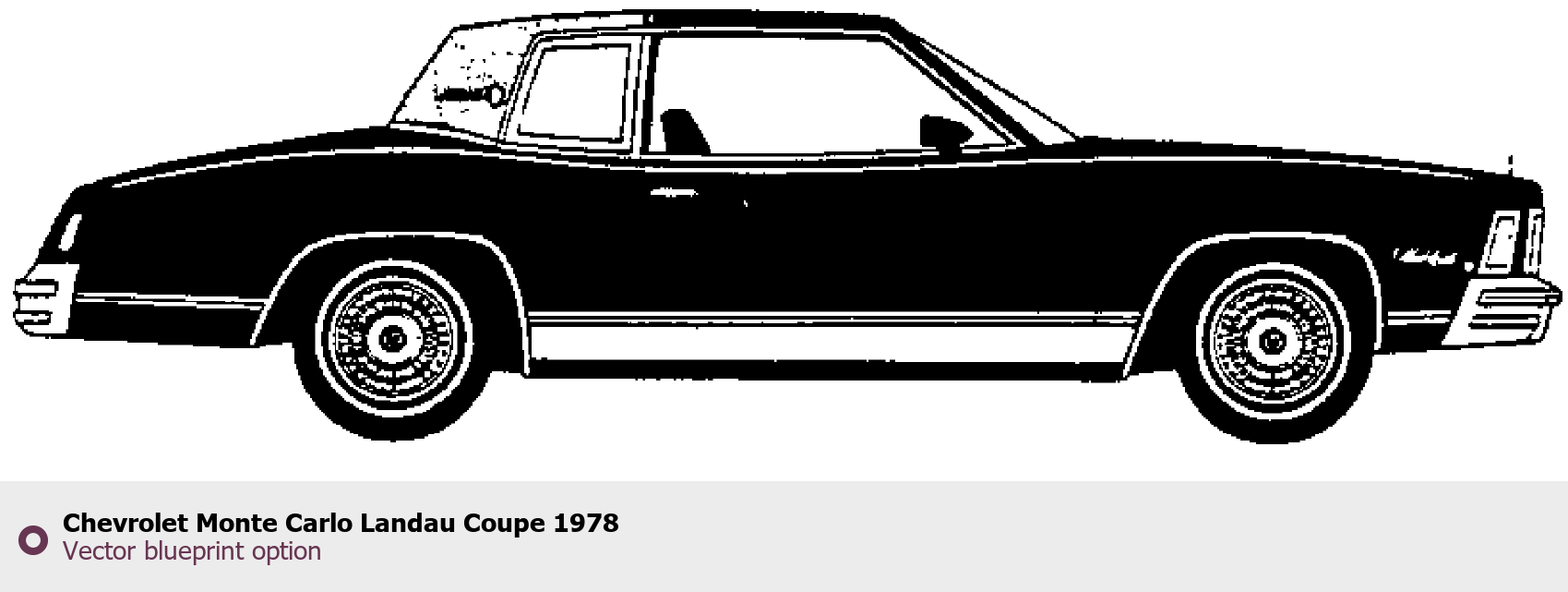 Raster blueprint of the 1978 Chevrolet Monte Carlo Landau Coupe Coupe. This free downloadable image can be used for graphic projects, digital design, and 3D modeling. The file provides accurate exterior proportions of the vehicle. Model year: 1978. Body type: Coupe.