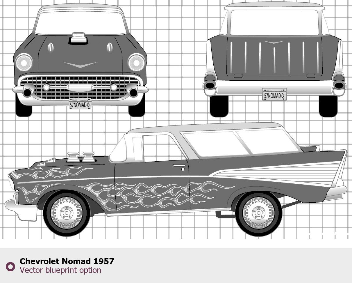 Raster blueprint of the 1957 Chevrolet Nomad Tag. This free downloadable image can be used for graphic projects, digital design, and 3D modeling. The file provides accurate exterior proportions of the vehicle. Model year: 1957. Body type: Tag.