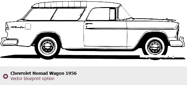 Raster blueprint of the 1956 Chevrolet Nomad Wagon Wagon. This free downloadable image can be used for graphic projects, digital design, and 3D modeling. The file provides accurate exterior proportions of the vehicle. Model year: 1956. Body type: Wagon.