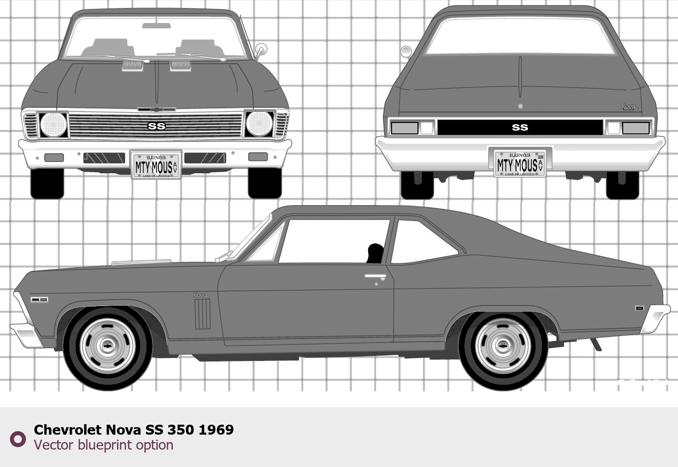 Raster blueprint of the 1969 Chevrolet Nova SS 350 Coupe. This free downloadable image can be used for graphic projects, digital design, and 3D modeling. The file provides accurate exterior proportions of the vehicle. Model year: 1969. Body type: Coupe.