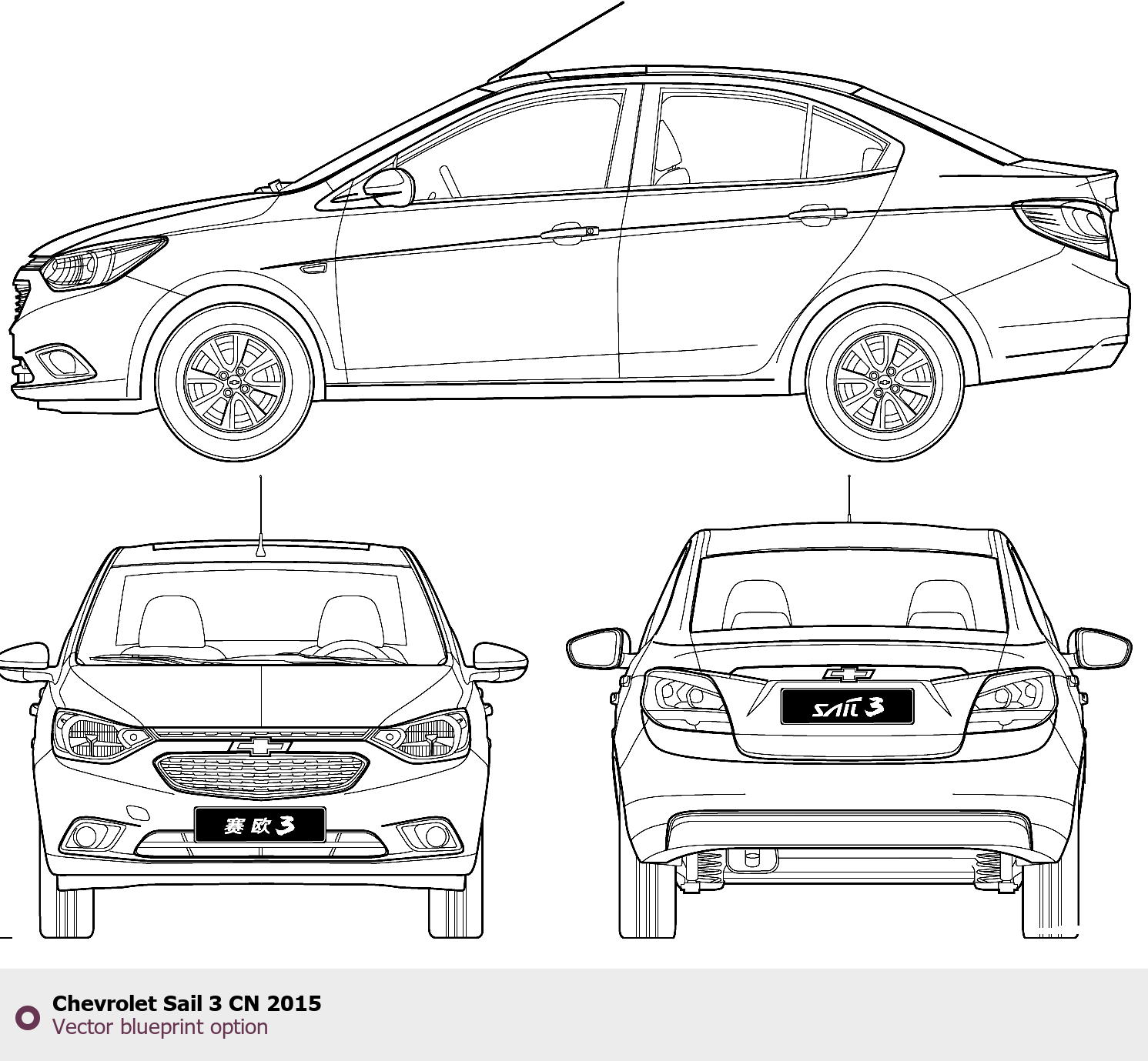 Raster blueprint of the 2015 Chevrolet Sail 3 CN Tag. This free downloadable image can be used for graphic projects, digital design, and 3D modeling. The file provides accurate exterior proportions of the vehicle. Model year: 2015. Body type: Tag.