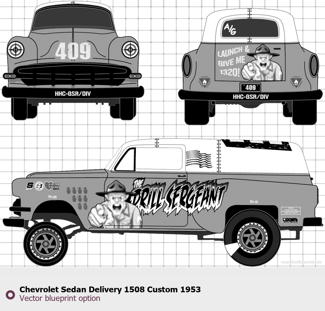 Raster blueprint of the 1953 Chevrolet Sedan Delivery 1508 Custom Sedan. This free downloadable image can be used for graphic projects, digital design, and 3D modeling. The file provides accurate exterior proportions of the vehicle. Model year: 1953. Body type: Sedan.