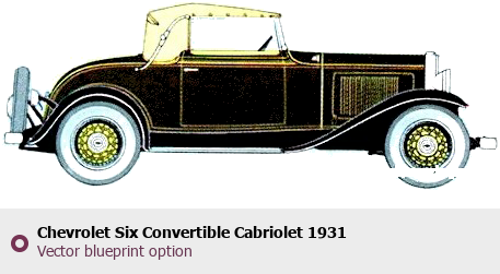 Raster blueprint of the 1931 Chevrolet Six Convertible Cabriolet Cabriolet. This free downloadable image can be used for graphic projects, digital design, and 3D modeling. The file provides accurate exterior proportions of the vehicle. Model year: 1931. Body type: Cabriolet.