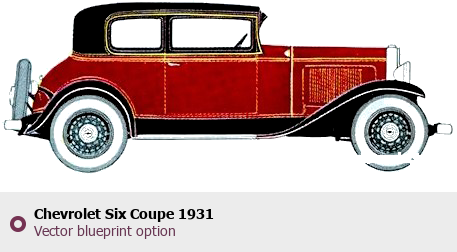 Raster blueprint of the 1931 Chevrolet Six Coupe Coupe. This free downloadable image can be used for graphic projects, digital design, and 3D modeling. The file provides accurate exterior proportions of the vehicle. Model year: 1931. Body type: Coupe.