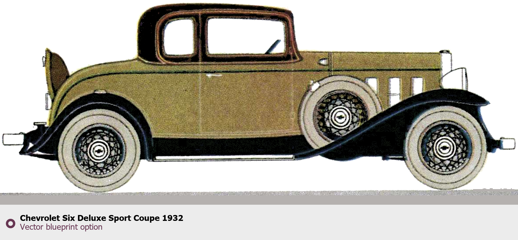 Raster blueprint of the 1932 Chevrolet Six Deluxe Sport Coupe Coupe. This free downloadable image can be used for graphic projects, digital design, and 3D modeling. The file provides accurate exterior proportions of the vehicle. Model year: 1932. Body type: Coupe.