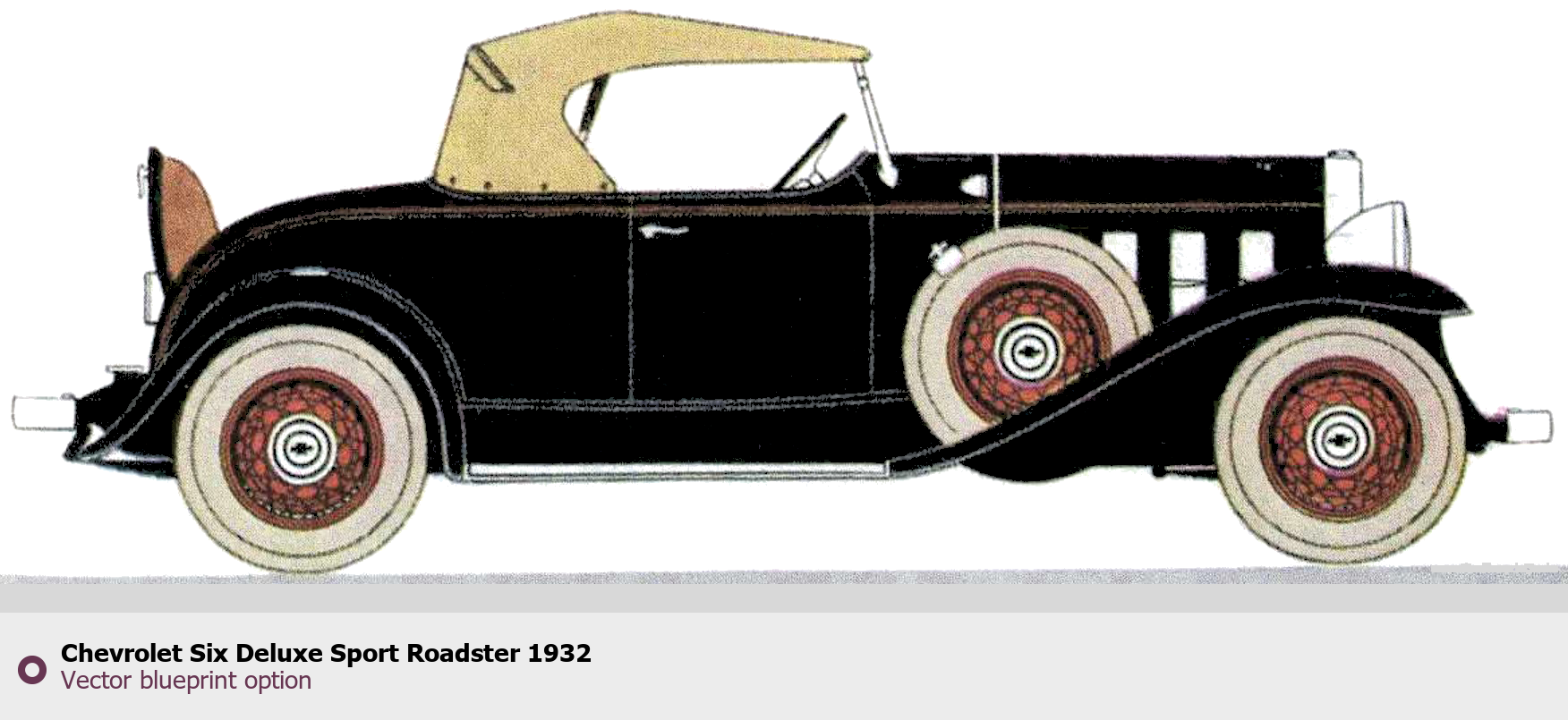 Raster blueprint of the 1932 Chevrolet Six Deluxe Sport Roadster Roadster. This free downloadable image can be used for graphic projects, digital design, and 3D modeling. The file provides accurate exterior proportions of the vehicle. Model year: 1932. Body type: Roadster.
