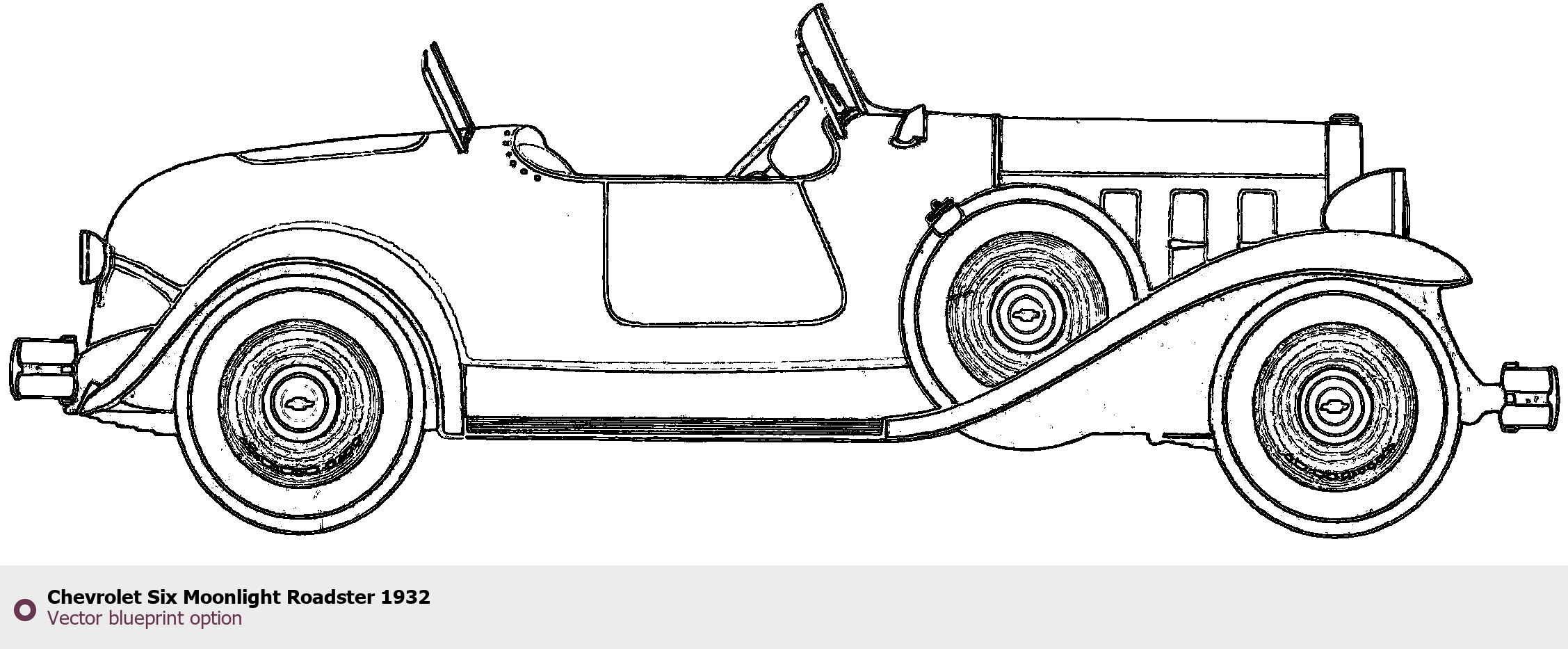Raster blueprint of the 1932 Chevrolet Six Moonlight Roadster Roadster. This free downloadable image can be used for graphic projects, digital design, and 3D modeling. The file provides accurate exterior proportions of the vehicle. Model year: 1932. Body type: Roadster.