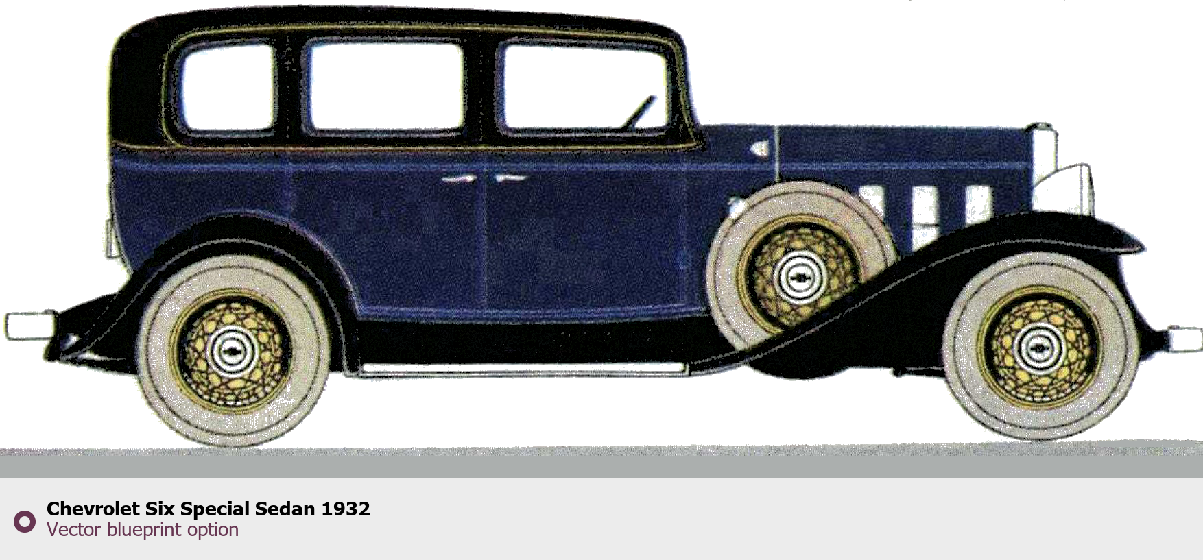 Raster blueprint of the 1932 Chevrolet Six Special Sedan Sedan. This free downloadable image can be used for graphic projects, digital design, and 3D modeling. The file provides accurate exterior proportions of the vehicle. Model year: 1932. Body type: Sedan.