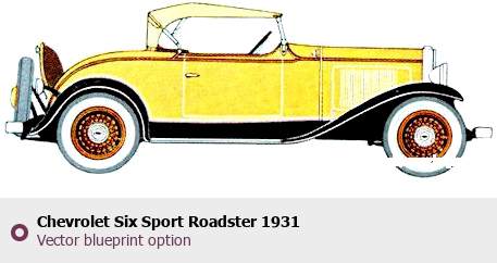 Raster blueprint of the 1931 Chevrolet Six Sport Roadster Roadster. This free downloadable image can be used for graphic projects, digital design, and 3D modeling. The file provides accurate exterior proportions of the vehicle. Model year: 1931. Body type: Roadster.