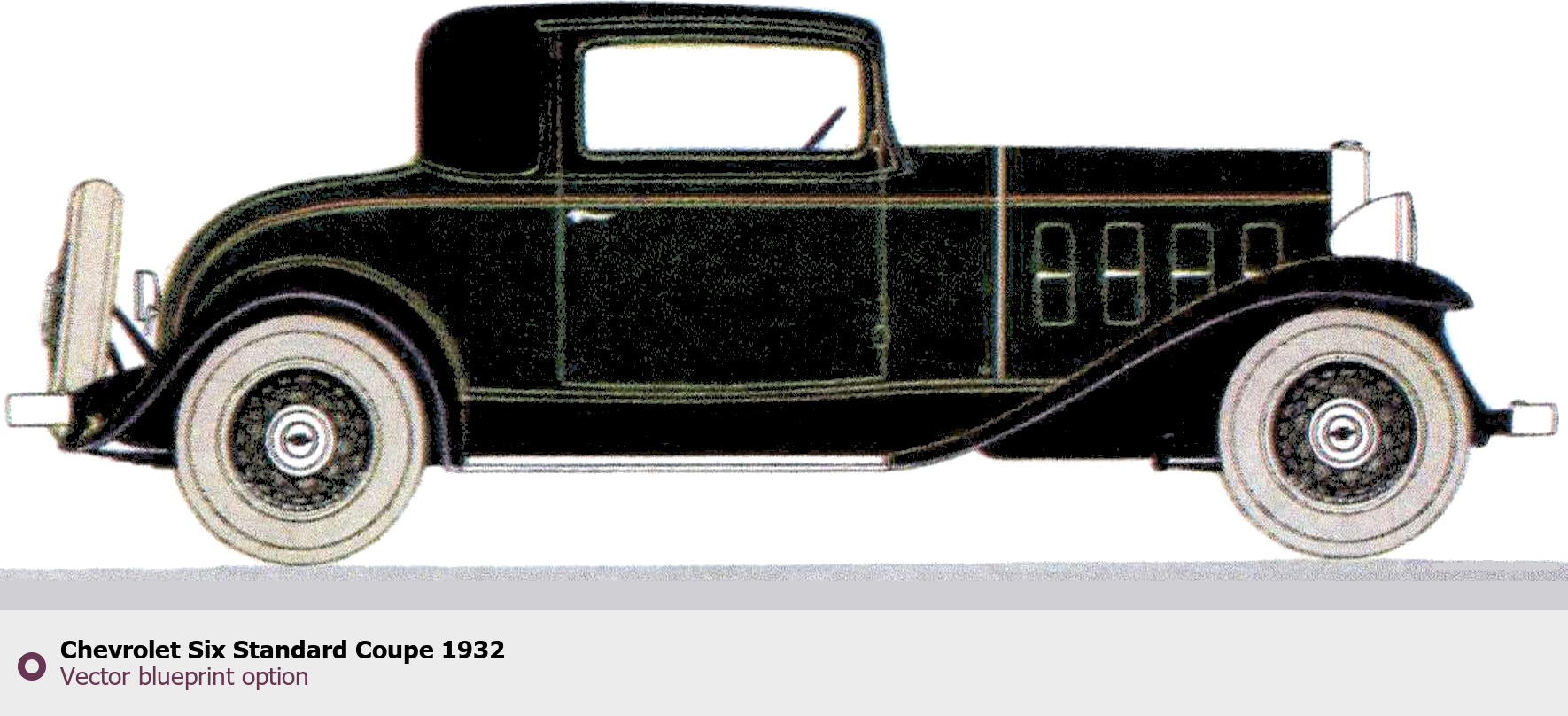 Raster blueprint of the 1932 Chevrolet Six Standard Coupe Coupe. This free downloadable image can be used for graphic projects, digital design, and 3D modeling. The file provides accurate exterior proportions of the vehicle. Model year: 1932. Body type: Coupe.