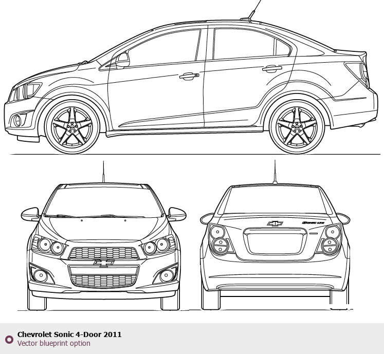 Raster blueprint of the 2011 Chevrolet Sonic 4-Door Tag. This free downloadable image can be used for graphic projects, digital design, and 3D modeling. The file provides accurate exterior proportions of the vehicle. Model year: 2011. Body type: Tag.