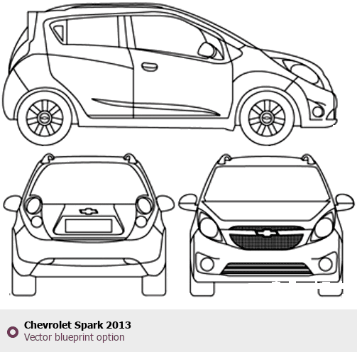 Raster blueprint of the 2013 Chevrolet Spark Hatchback. This free downloadable image can be used for graphic projects, digital design, and 3D modeling. The file provides accurate exterior proportions of the vehicle. Model year: 2013. Body type: Hatchback.