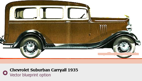 Raster blueprint of the 1935 Chevrolet Suburban Carryall SUV. This free downloadable image can be used for graphic projects, digital design, and 3D modeling. The file provides accurate exterior proportions of the vehicle. Model year: 1935. Body type: SUV.