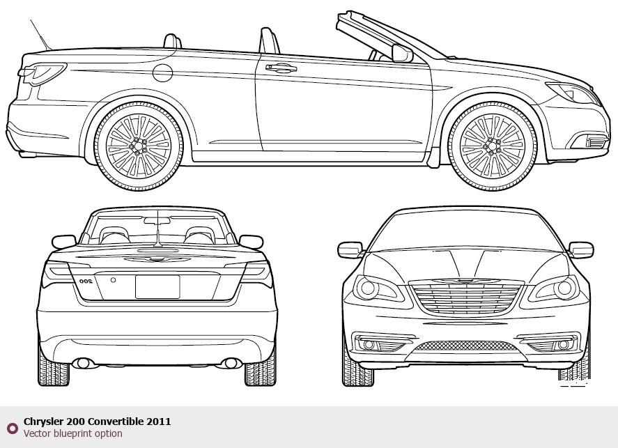 Raster blueprint of the 2011 Chrysler 200 Convertible Cabriolet. This free downloadable image can be used for graphic projects, digital design, and 3D modeling. The file provides accurate exterior proportions of the vehicle. Model year: 2011. Body type: Cabriolet.