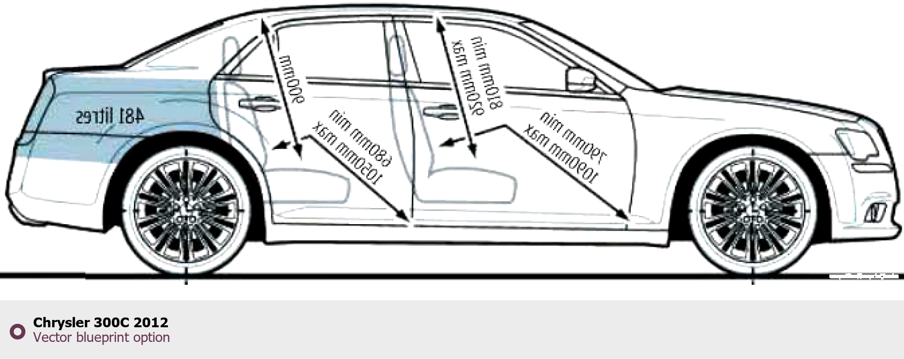 Raster blueprint of the 2012 Chrysler 300C Tag. This free downloadable image can be used for graphic projects, digital design, and 3D modeling. The file provides accurate exterior proportions of the vehicle. Model year: 2012. Body type: Tag.