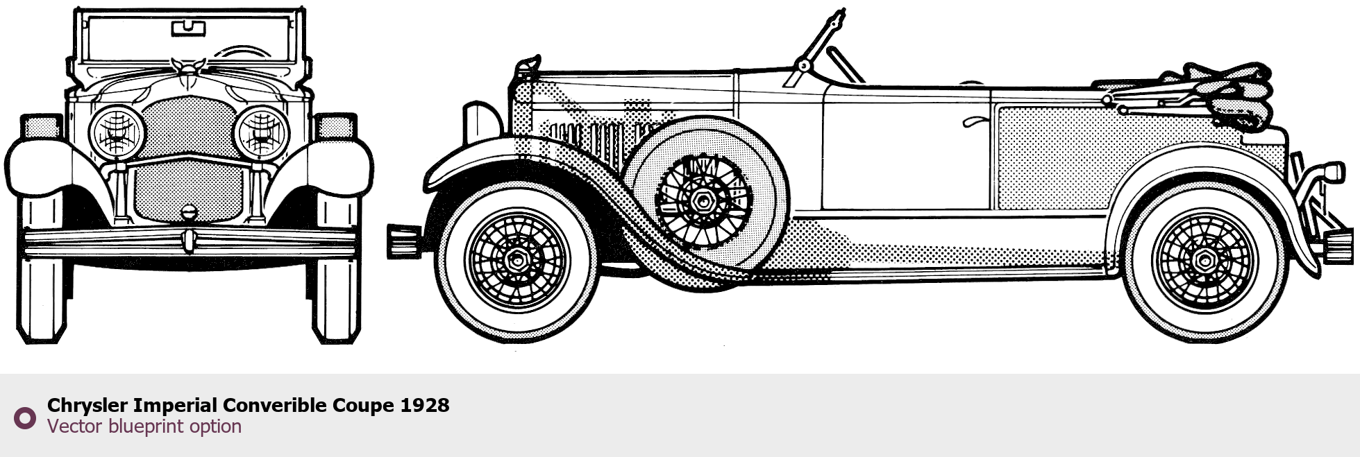 Raster blueprint of the 1928 Chrysler Imperial Converible Coupe Coupe. This free downloadable image can be used for graphic projects, digital design, and 3D modeling. The file provides accurate exterior proportions of the vehicle. Model year: 1928. Body type: Coupe.