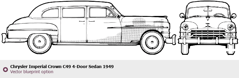 Raster blueprint of the 1949 Chrysler Imperial Crown C49 4-Door Sedan Sedan. This free downloadable image can be used for graphic projects, digital design, and 3D modeling. The file provides accurate exterior proportions of the vehicle. Model year: 1949. Body type: Sedan.