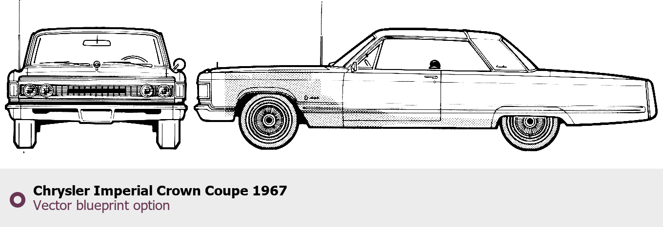Raster blueprint of the 1967 Chrysler Imperial Crown Coupe Coupe. This free downloadable image can be used for graphic projects, digital design, and 3D modeling. The file provides accurate exterior proportions of the vehicle. Model year: 1967. Body type: Coupe.