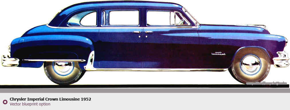Raster blueprint of the 1952 Chrysler Imperial Crown Limousine Limousine. This free downloadable image can be used for graphic projects, digital design, and 3D modeling. The file provides accurate exterior proportions of the vehicle. Model year: 1952. Body type: Limousine.