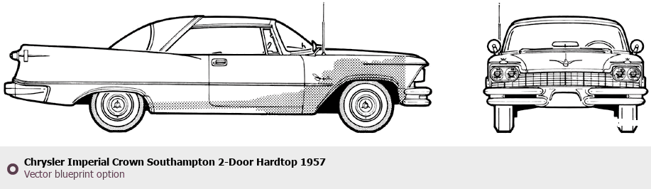Raster blueprint of the 1957 Chrysler Imperial Crown Southampton 2-Door Hardtop Tag. This free downloadable image can be used for graphic projects, digital design, and 3D modeling. The file provides accurate exterior proportions of the vehicle. Model year: 1957. Body type: Tag.
