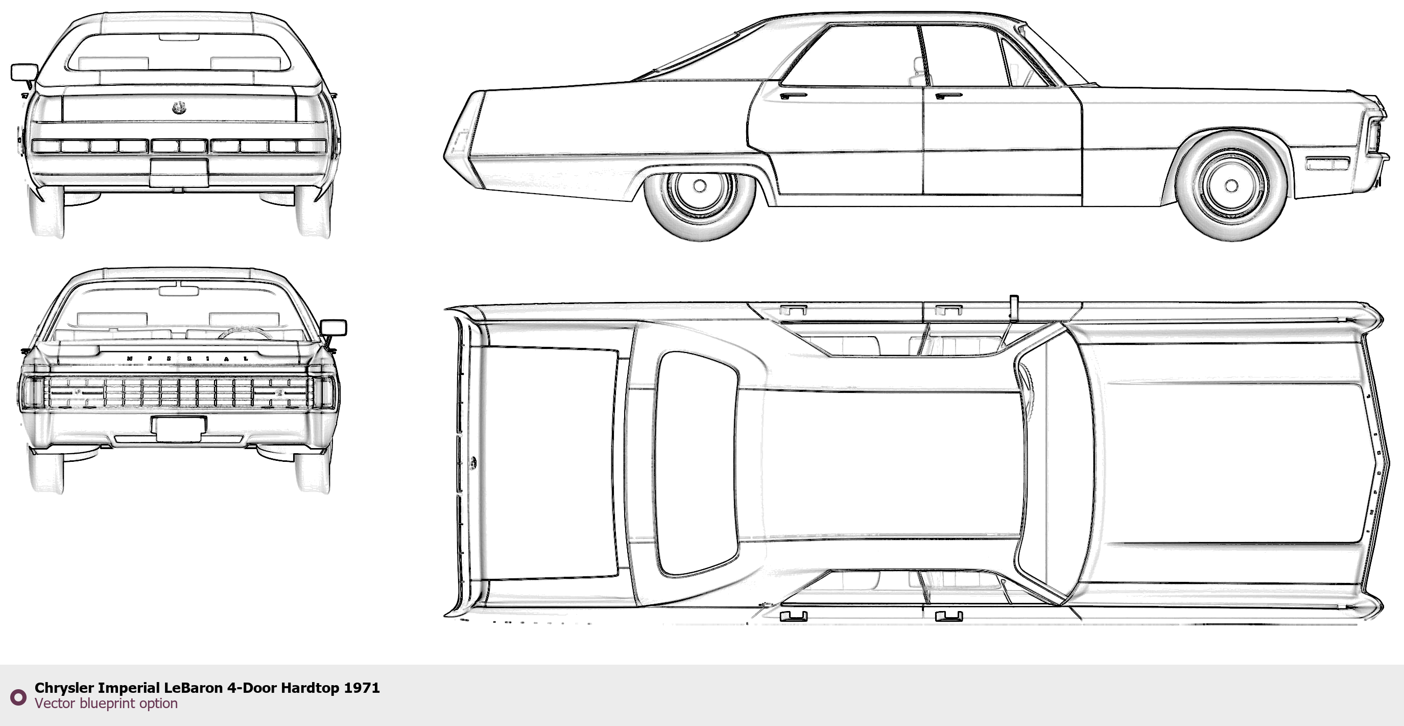 Raster blueprint of the 1971 Chrysler Imperial LeBaron 4-Door Hardtop Tag. This free downloadable image can be used for graphic projects, digital design, and 3D modeling. The file provides accurate exterior proportions of the vehicle. Model year: 1971. Body type: Tag.