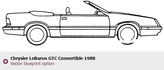 Raster blueprint of the 1988 Chrysler LeBaron GTC Convertible Cabriolet. This free downloadable image can be used for graphic projects, digital design, and 3D modeling. The file provides accurate exterior proportions of the vehicle. Model year: 1988. Body type: Cabriolet.