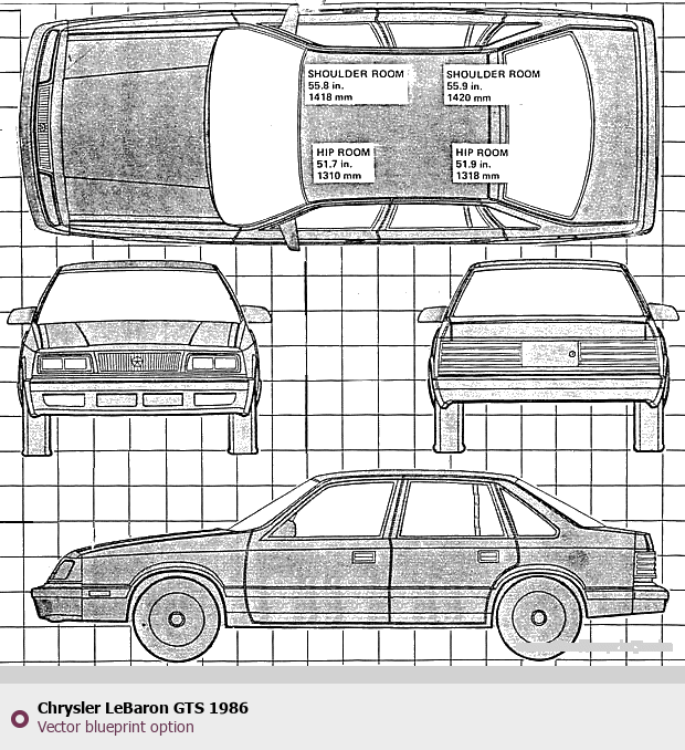 Raster blueprint of the 1986 Chrysler LeBaron GTS Tag. This free downloadable image can be used for graphic projects, digital design, and 3D modeling. The file provides accurate exterior proportions of the vehicle. Model year: 1986. Body type: Tag.