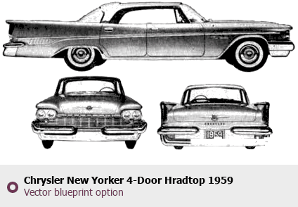 Raster blueprint of the 1959 Chrysler New Yorker 4-Door Hradtop Tag. This free downloadable image can be used for graphic projects, digital design, and 3D modeling. The file provides accurate exterior proportions of the vehicle. Model year: 1959. Body type: Tag.