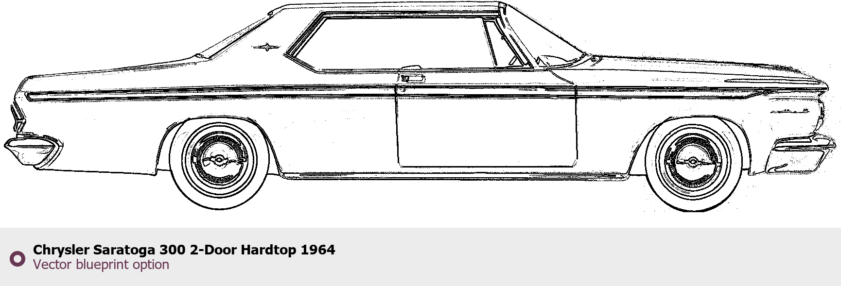 Raster blueprint of the 1964 Chrysler Saratoga 300 2-Door Hardtop Tag. This free downloadable image can be used for graphic projects, digital design, and 3D modeling. The file provides accurate exterior proportions of the vehicle. Model year: 1964. Body type: Tag.