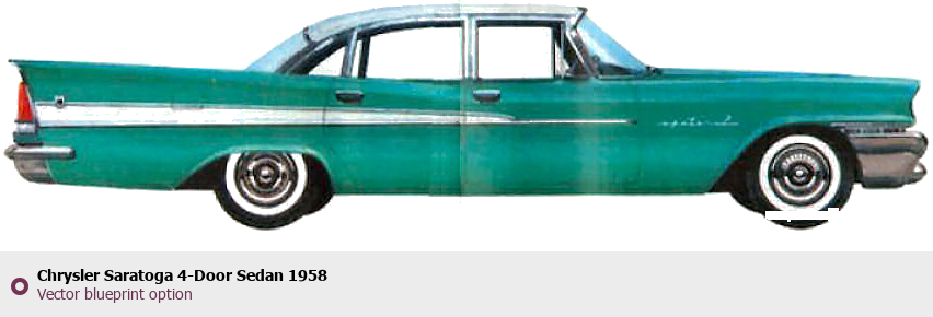 Raster blueprint of the 1958 Chrysler Saratoga 4-Door Sedan Sedan. This free downloadable image can be used for graphic projects, digital design, and 3D modeling. The file provides accurate exterior proportions of the vehicle. Model year: 1958. Body type: Sedan.