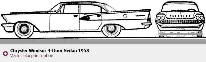 Raster blueprint of the 1958 Chrysler Windsor 4-Door Sedan Sedan. This free downloadable image can be used for graphic projects, digital design, and 3D modeling. The file provides accurate exterior proportions of the vehicle. Model year: 1958. Body type: Sedan.