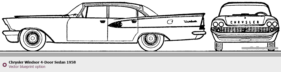 Raster blueprint of the 1958 Chrysler Windsor 4-Door Sedan Sedan. This free downloadable image can be used for graphic projects, digital design, and 3D modeling. The file provides accurate exterior proportions of the vehicle. Model year: 1958. Body type: Sedan.