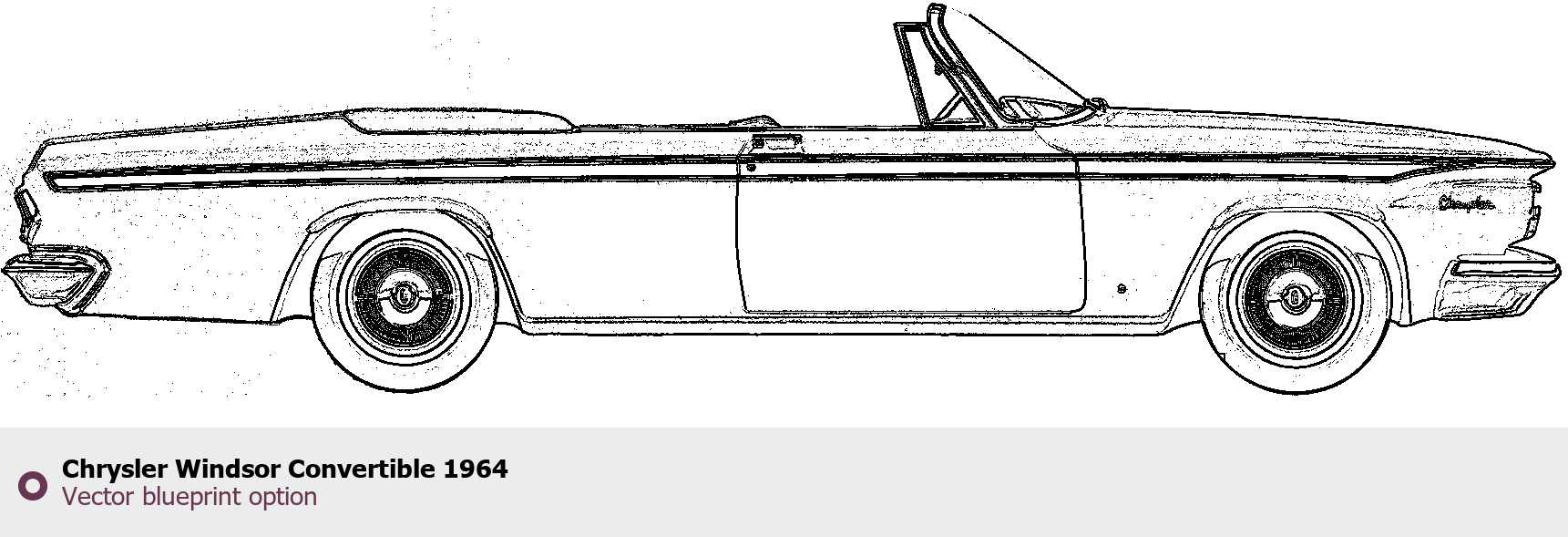 Raster blueprint of the 1964 Chrysler Windsor Convertible Cabriolet. This free downloadable image can be used for graphic projects, digital design, and 3D modeling. The file provides accurate exterior proportions of the vehicle. Model year: 1964. Body type: Cabriolet.
