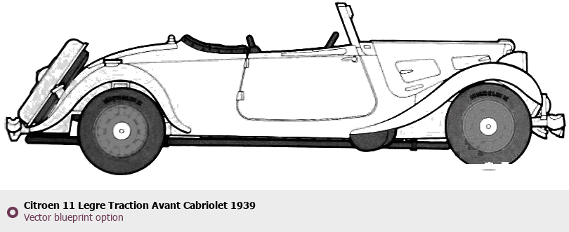 Raster blueprint of the 1939 Citroen 11 Legre Traction Avant Cabriolet Cabriolet. This free downloadable image can be used for graphic projects, digital design, and 3D modeling. The file provides accurate exterior proportions of the vehicle. Model year: 1939. Body type: Cabriolet.