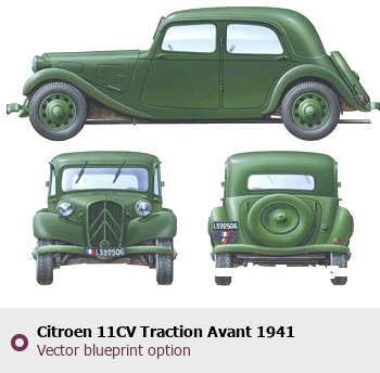 Raster blueprint of the 1941 Citroen 11CV Traction Avant Tag. This free downloadable image can be used for graphic projects, digital design, and 3D modeling. The file provides accurate exterior proportions of the vehicle. Model year: 1941. Body type: Tag.