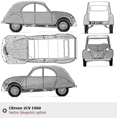 Raster blueprint of the 1960 Citroen 2CV Hatchback. This free downloadable image can be used for graphic projects, digital design, and 3D modeling. The file provides accurate exterior proportions of the vehicle. Model year: 1960. Body type: Hatchback.
