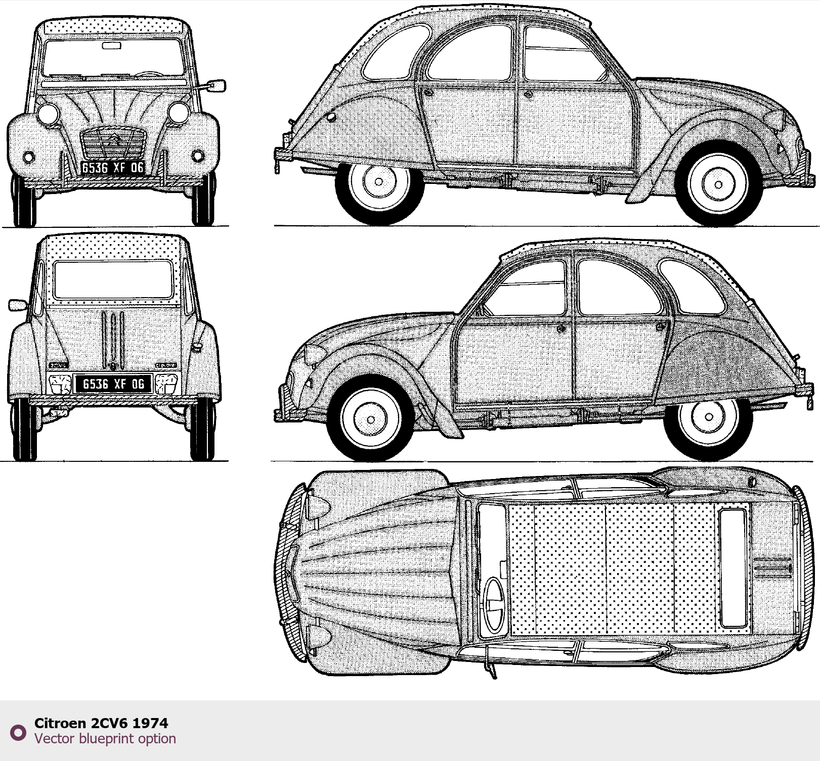 Raster blueprint of the 1974 Citroen 2CV6 Hatchback. This free downloadable image can be used for graphic projects, digital design, and 3D modeling. The file provides accurate exterior proportions of the vehicle. Model year: 1974. Body type: Hatchback.