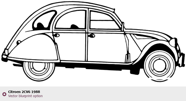 Raster blueprint of the 1988 Citroen 2CV6 Hatchback. This free downloadable image can be used for graphic projects, digital design, and 3D modeling. The file provides accurate exterior proportions of the vehicle. Model year: 1988. Body type: Hatchback.