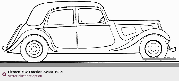 Raster blueprint of the 1934 Citroen 7CV Traction Avant Tag. This free downloadable image can be used for graphic projects, digital design, and 3D modeling. The file provides accurate exterior proportions of the vehicle. Model year: 1934. Body type: Tag.