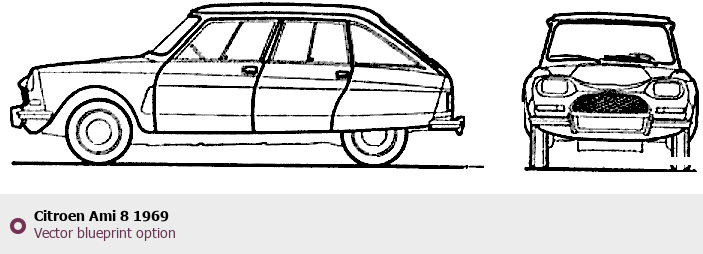 Raster blueprint of the 1969 Citroen Ami 8 Sedan. This free downloadable image can be used for graphic projects, digital design, and 3D modeling. The file provides accurate exterior proportions of the vehicle. Model year: 1969. Body type: Sedan.