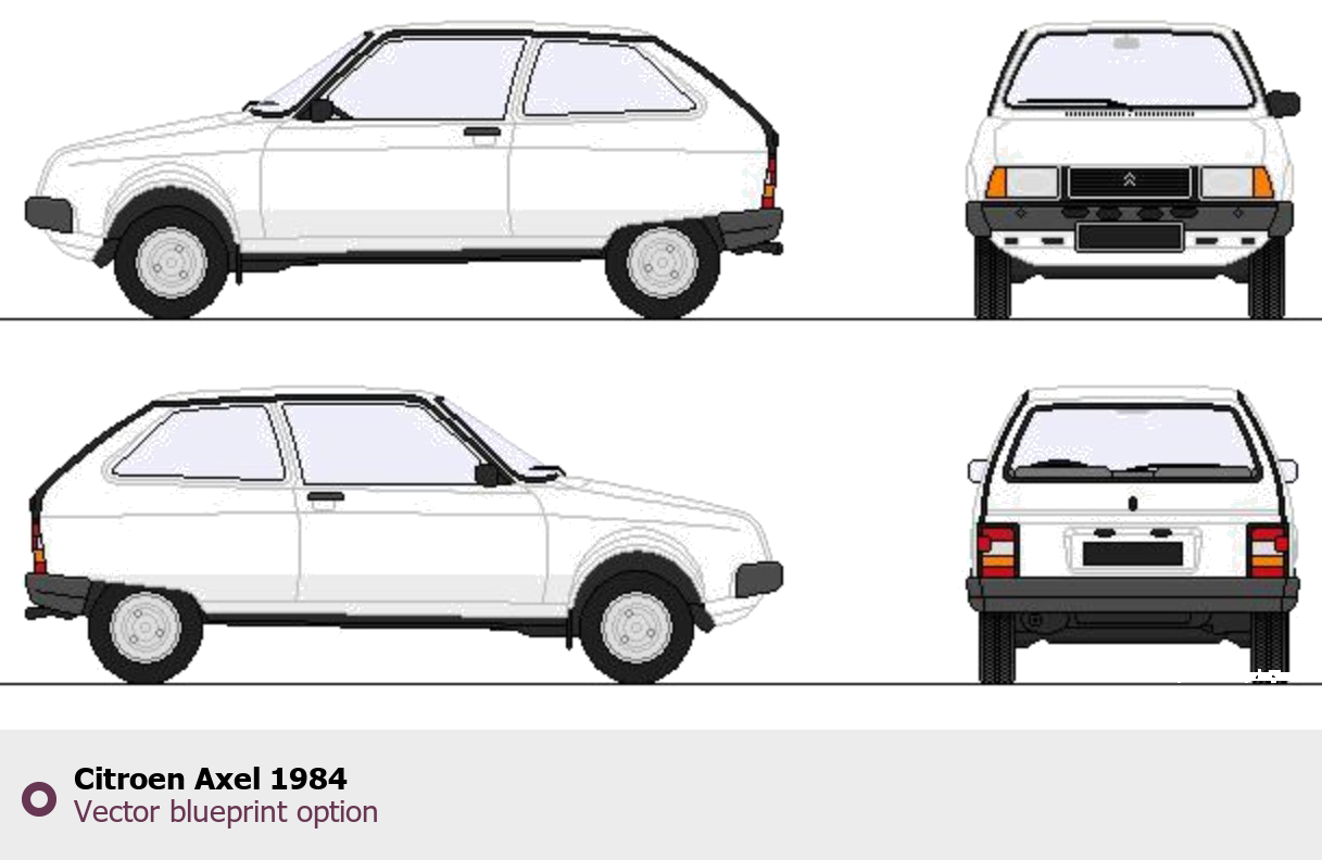 Raster blueprint of the 1984 Citroen Axel Tag. This free downloadable image can be used for graphic projects, digital design, and 3D modeling. The file provides accurate exterior proportions of the vehicle. Model year: 1984. Body type: Tag.