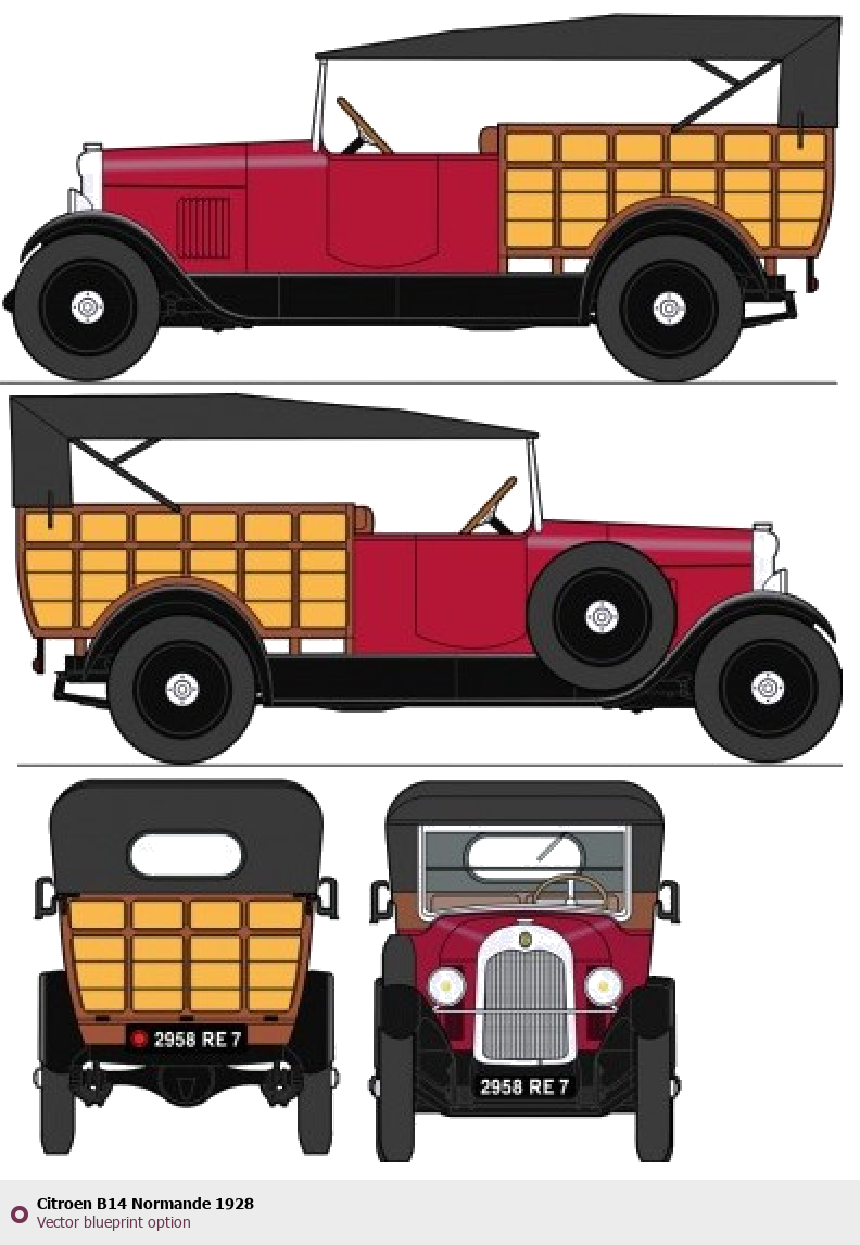 Raster blueprint of the 1928 Citroen B14 Normande Tag. This free downloadable image can be used for graphic projects, digital design, and 3D modeling. The file provides accurate exterior proportions of the vehicle. Model year: 1928. Body type: Tag.