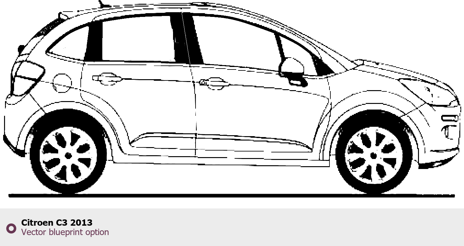 Raster blueprint of the 2013 Citroen C3 Tag. This free downloadable image can be used for graphic projects, digital design, and 3D modeling. The file provides accurate exterior proportions of the vehicle. Model year: 2013. Body type: Tag.