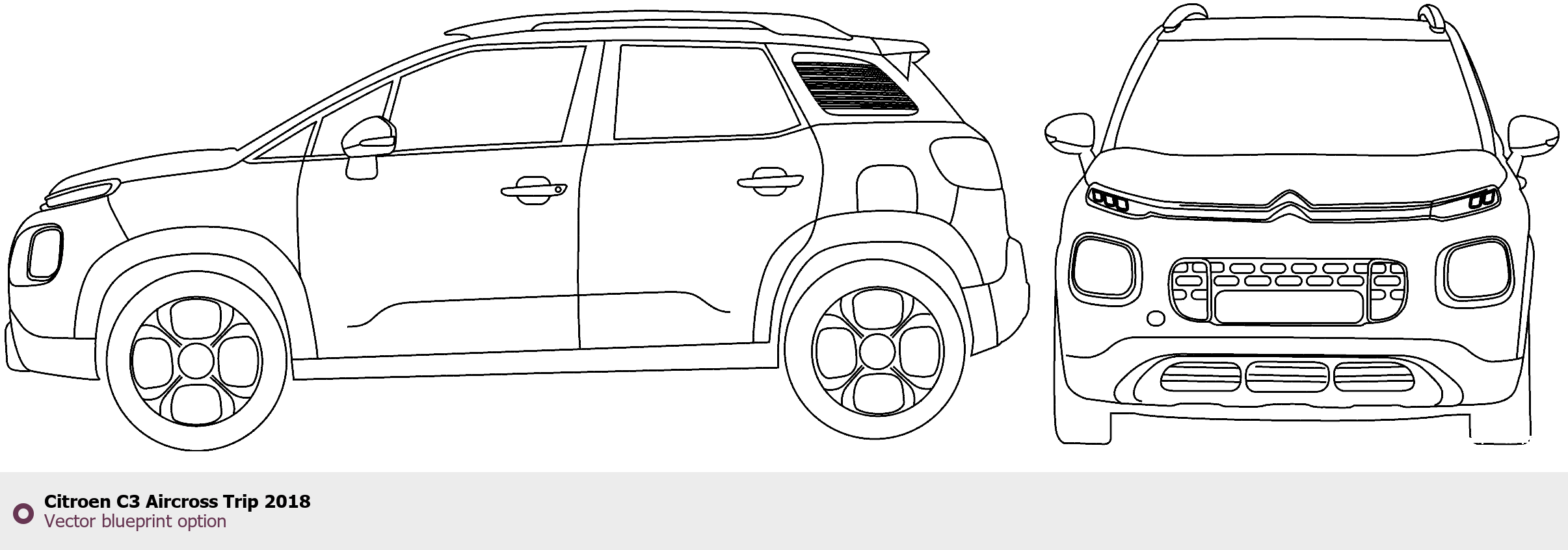Raster blueprint of the 2018 Citroen C3 Aircross Trip Tag. This free downloadable image can be used for graphic projects, digital design, and 3D modeling. The file provides accurate exterior proportions of the vehicle. Model year: 2018. Body type: Tag.