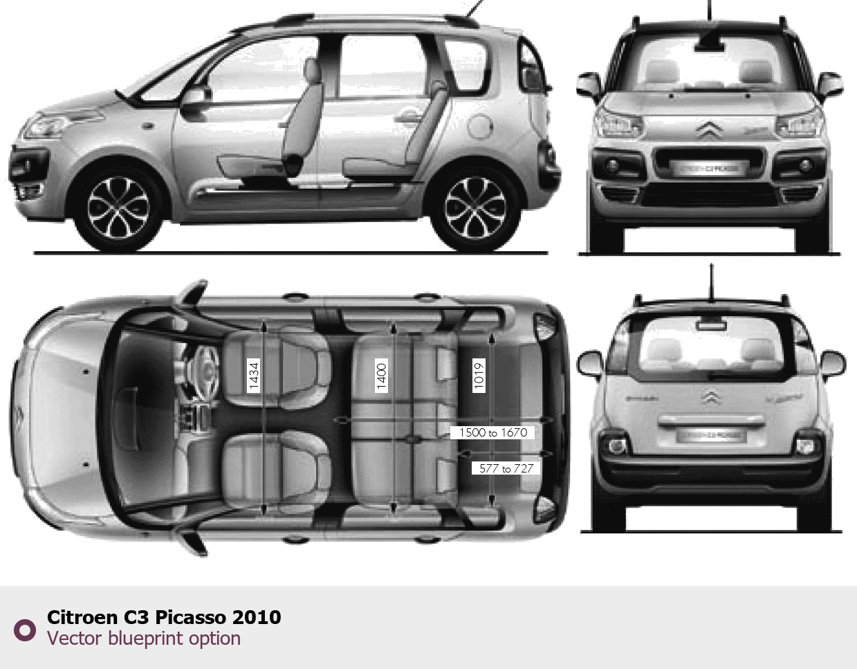 Raster blueprint of the 2010 Citroen C3 Picasso Tag. This free downloadable image can be used for graphic projects, digital design, and 3D modeling. The file provides accurate exterior proportions of the vehicle. Model year: 2010. Body type: Tag.