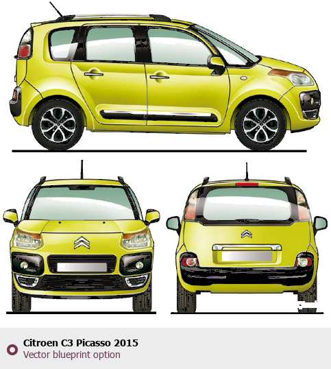 Raster blueprint of the 2015 Citroen C3 Picasso Tag. This free downloadable image can be used for graphic projects, digital design, and 3D modeling. The file provides accurate exterior proportions of the vehicle. Model year: 2015. Body type: Tag.