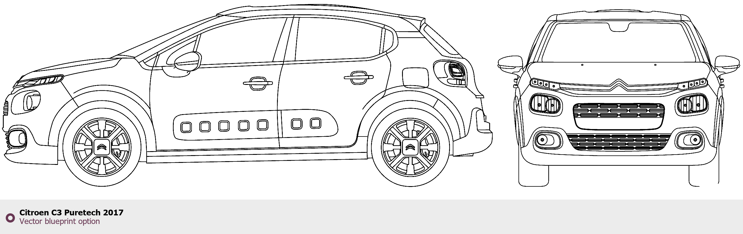 Raster blueprint of the 2017 Citroen C3 Puretech Tag. This free downloadable image can be used for graphic projects, digital design, and 3D modeling. The file provides accurate exterior proportions of the vehicle. Model year: 2017. Body type: Tag.
