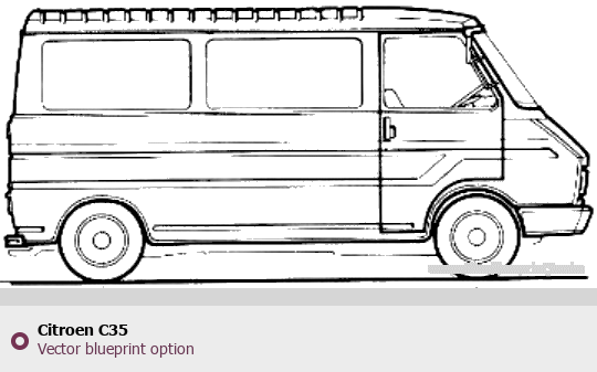 Raster blueprint of the Citroen C35 Tag. This free downloadable image can be used for graphic projects, digital design, and 3D modeling. The file provides accurate exterior proportions of the vehicle. Body type: Tag.