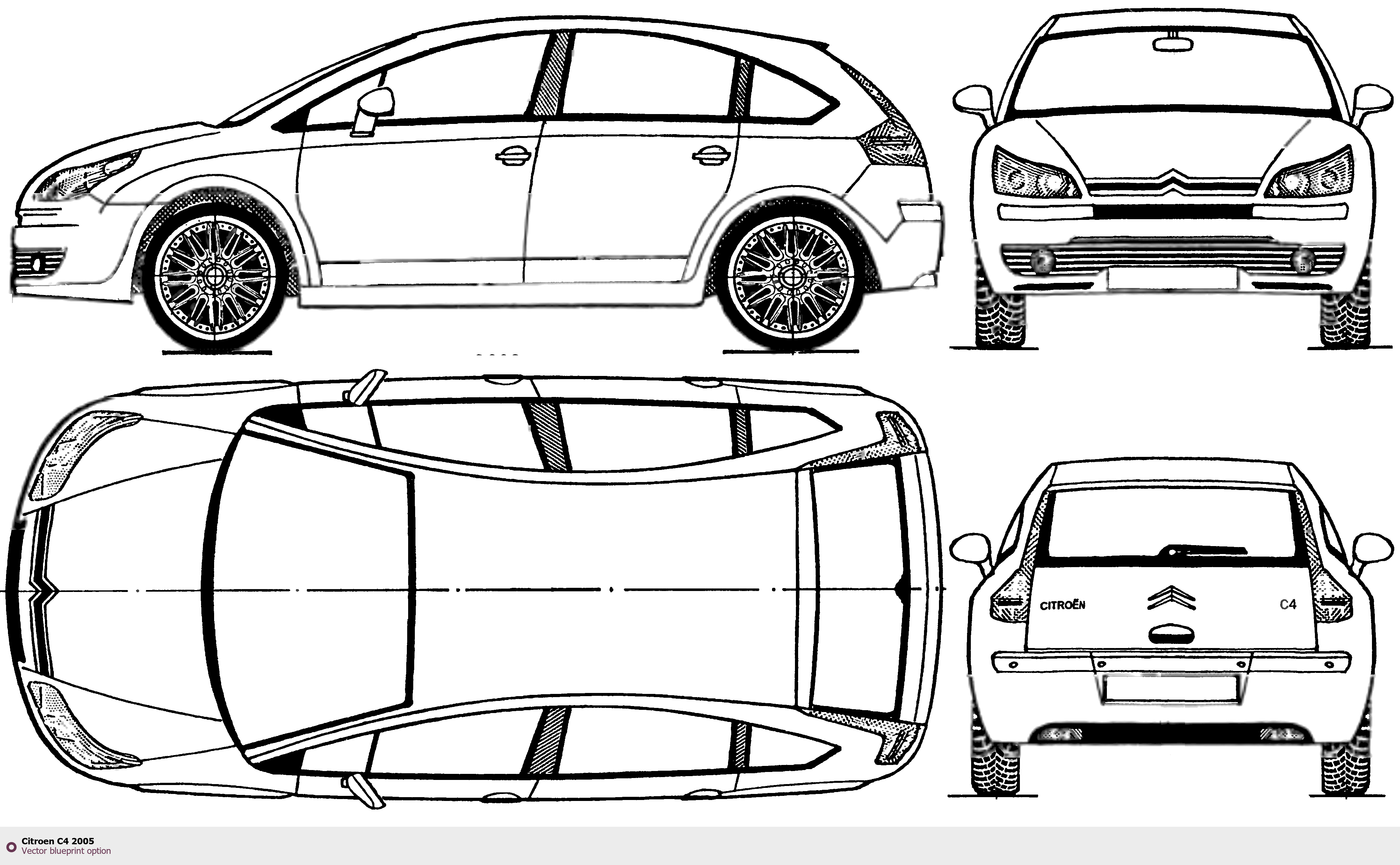 Raster blueprint of the 2005 Citroen C4 Tag. This free downloadable image can be used for graphic projects, digital design, and 3D modeling. The file provides accurate exterior proportions of the vehicle. Model year: 2005. Body type: Tag.