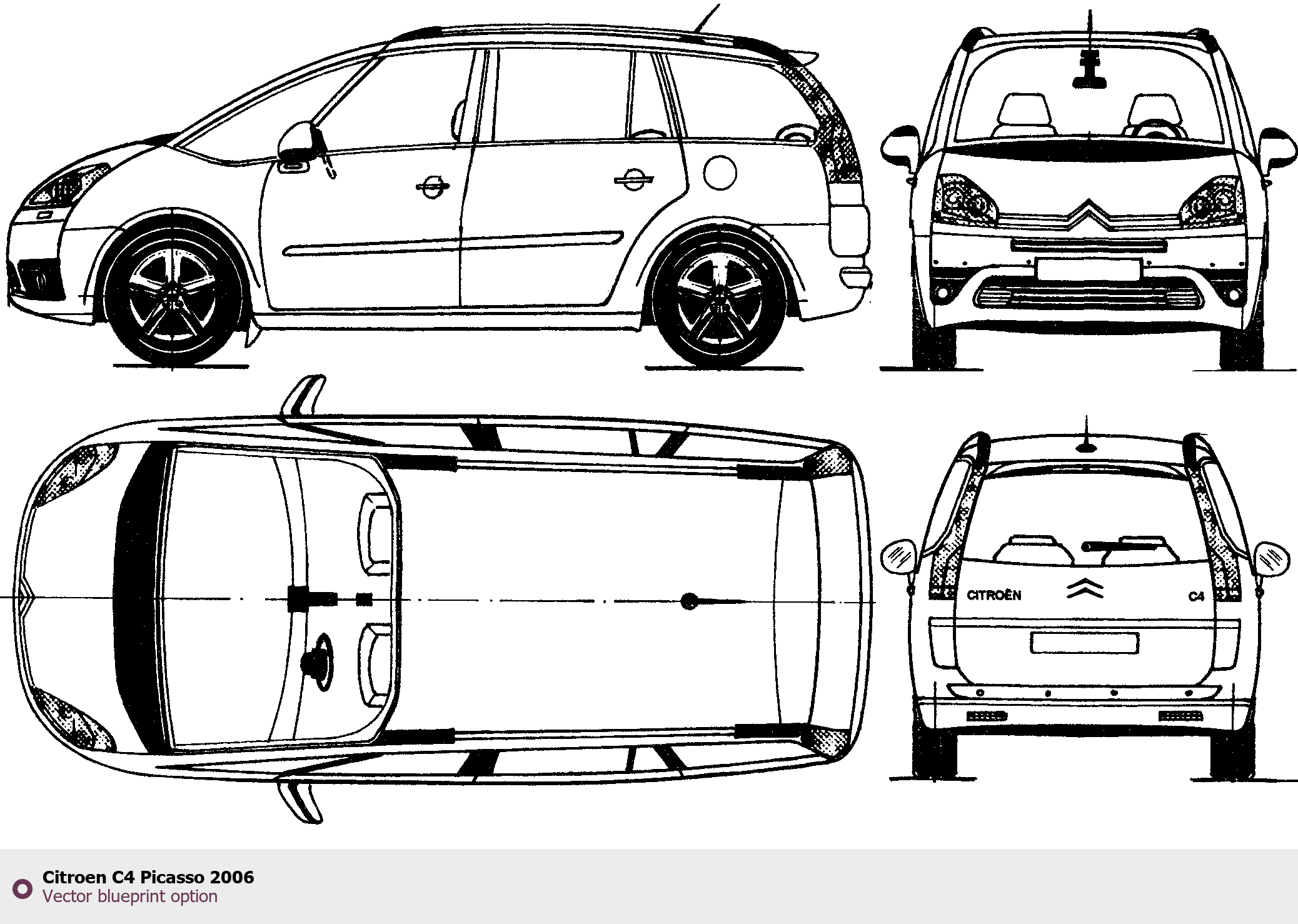 Raster blueprint of the 2006 Citroen C4 Picasso Tag. This free downloadable image can be used for graphic projects, digital design, and 3D modeling. The file provides accurate exterior proportions of the vehicle. Model year: 2006. Body type: Tag.